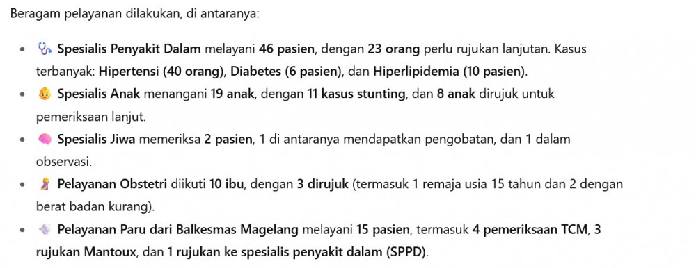 Kegiatan ini menghadirkan layanan kesehatan langsung dari para dokter spesialis, supaya masyarakat desa nggak perlu jauh-jauh ke rumah sakit untuk mendapatkan pemeriksaan lanjutan.
